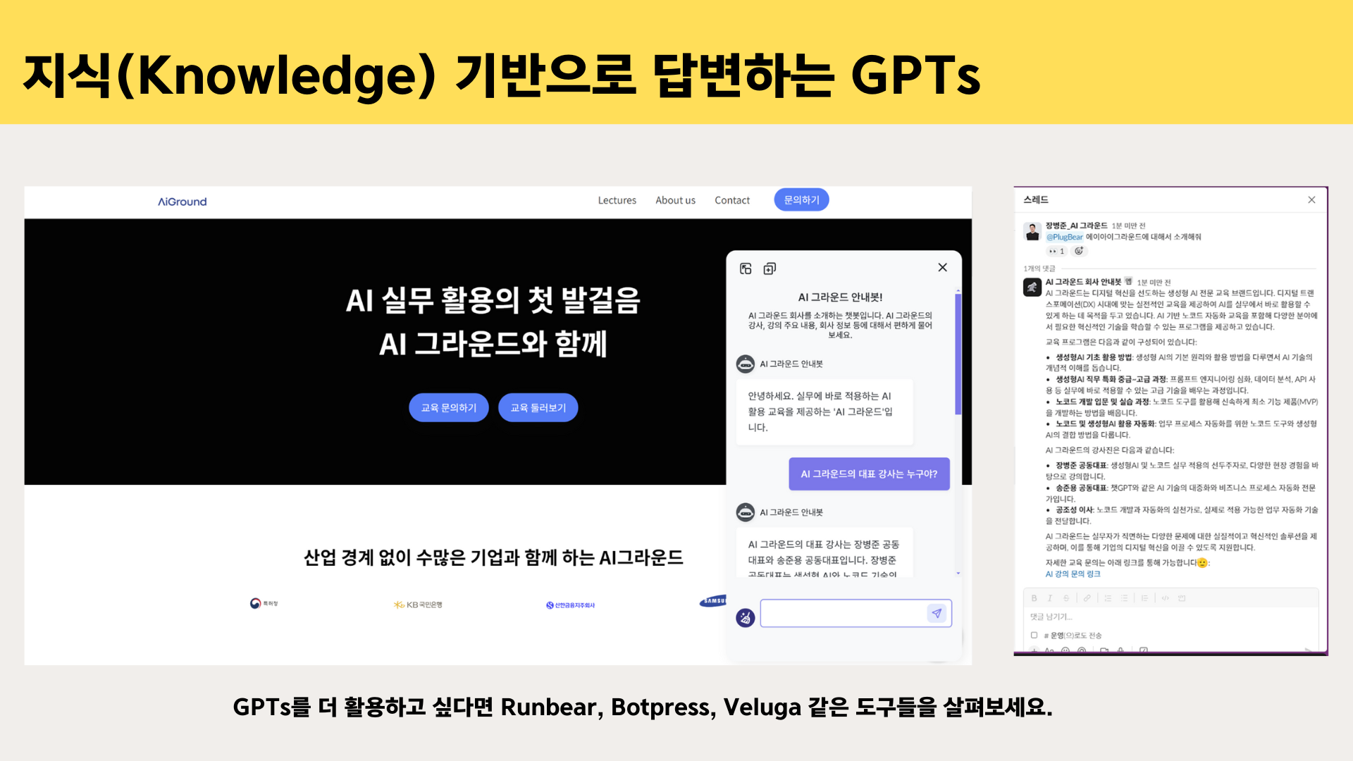 GPTs의 활용 범위를 더 넓히고 싶다면, Runbear, Botpress, Veluga 같은 도구들을 살펴보세요. 이들을 이용하면 GPTs 기반의 커스텀 챗봇을 쉽게 만들고, 웹사이트, 슬랙, 팀즈 등 다양한 플랫폼에 연동할 수 있습니다.