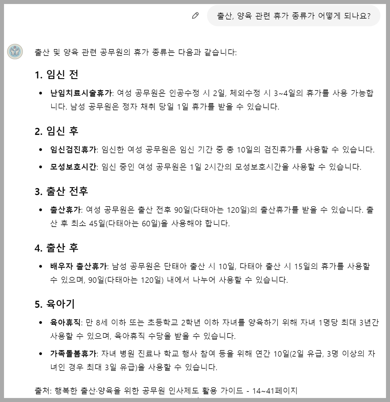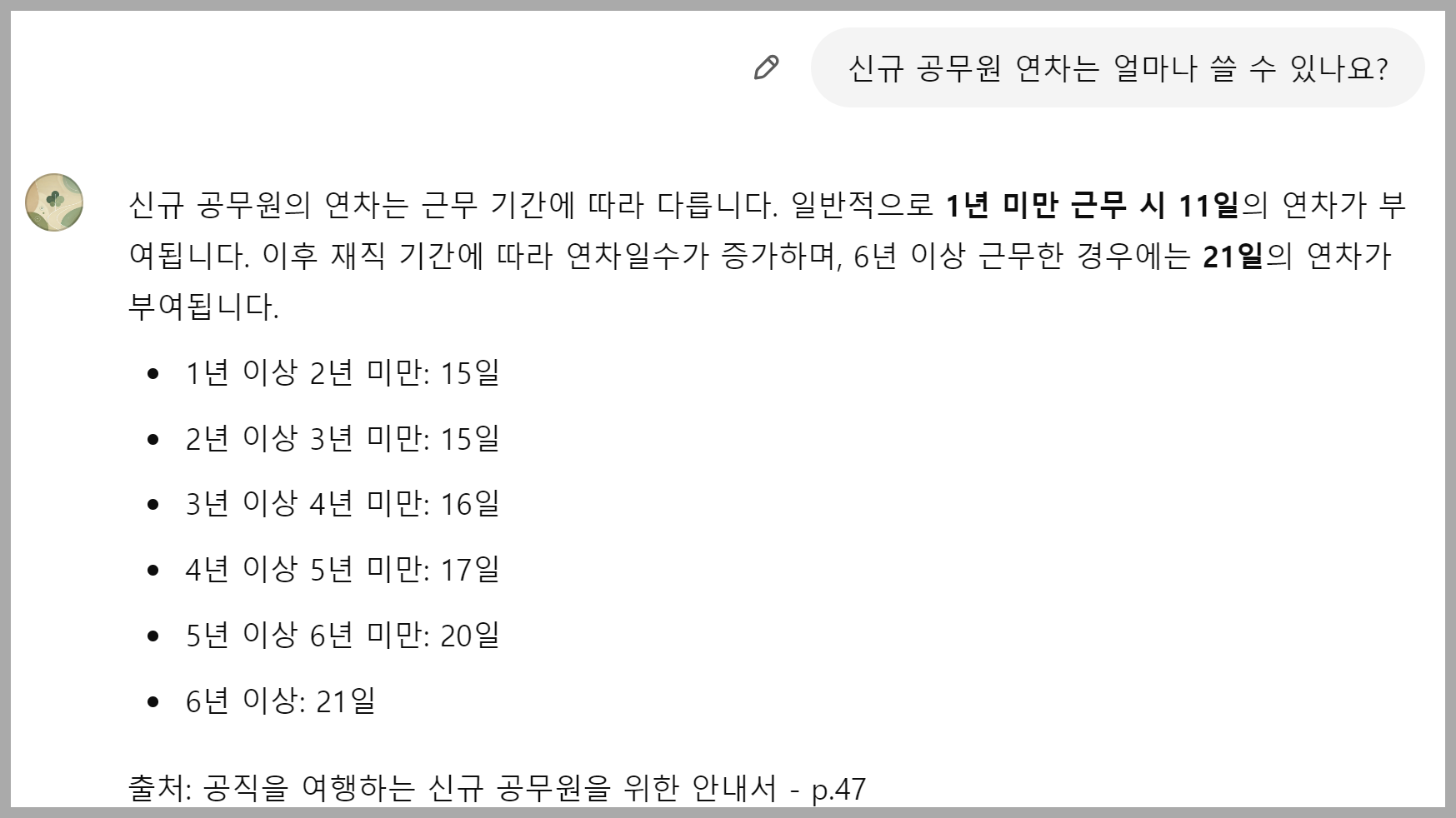 이 AI 비서는 여러분이 원하는 모든 정보를 정확하게 알고 있습니다. 신규 공무원의 연차 사용 규정부터 출산 및 양육 관련 휴가 정보까지, 모든 걸 척척 대답해주죠.