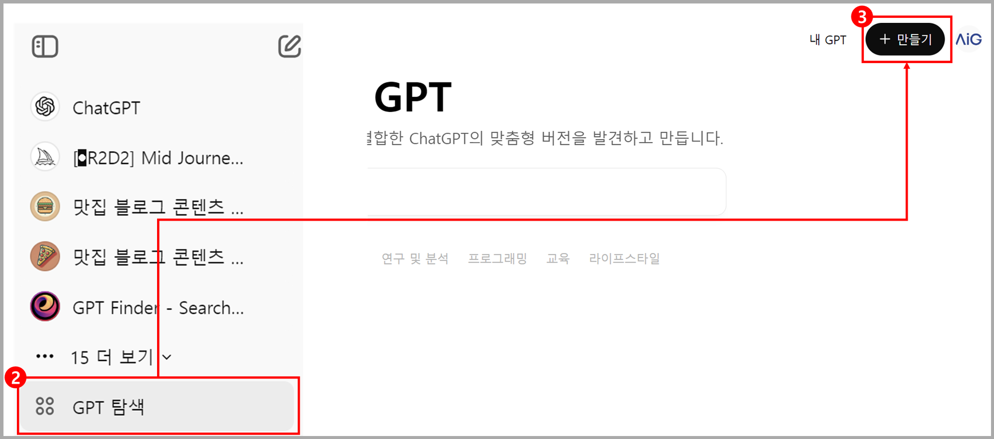 - 왼쪽 메뉴에서 'GPT 탐색'을 클릭합니다.