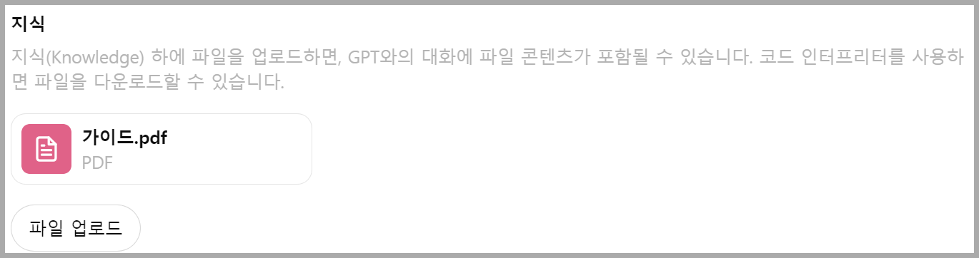 마지막으로 '지식' 영역에 우리가 지식(Knowledge)으로 제공해줄 파일을 업로드합니다. 앞선 시연에서 활용한 자료는 다음 링크에서 다운로드 받을 수 있습니다.