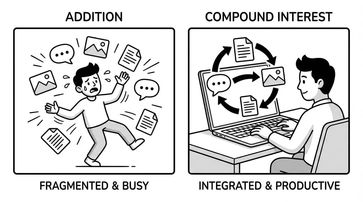 단편적인 AI 팁이나 프롬프트 해킹이 효과가 없는 이유도 여기에 있습니다. 그걸 추가할 통합 시스템이 없으니까요. 아무리 좋은 투자 팁을 들어도, 계좌가 없으면 복리가 쌓일 수 없는 것과 같습니다.