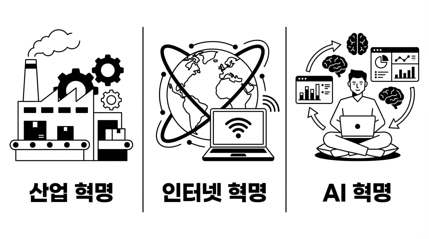 첫 번째는 산업혁명이었습니다. 기계와 조립 라인이 등장하면서 수공업이 대량 생산으로 바뀌었죠. 비즈니스가 **'만드는 방식(Making)'**을 근본적으로 바꾼 순간입니다.