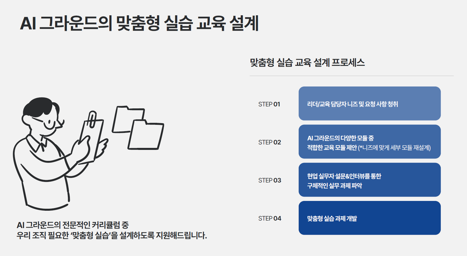 AI 그라운드는 최대한 이러한 기업의 AI 활용 로드맵에 맞게, 그리고 개별 기업의 문제 정의에 맞게 AI 교육 컨텐츠를 제공하려고 고민하고 있습니다. 단순 지식 전달이 아니라 실무 적용을 목표로 하고, 일회성 체험이 아니라 지속 가능한 도구를 함께 만들고, 교육 만족도가 아니라 실제 업무 변화를 창출해 내는 것을 목표로 2026년을 달려보고자 합니다.