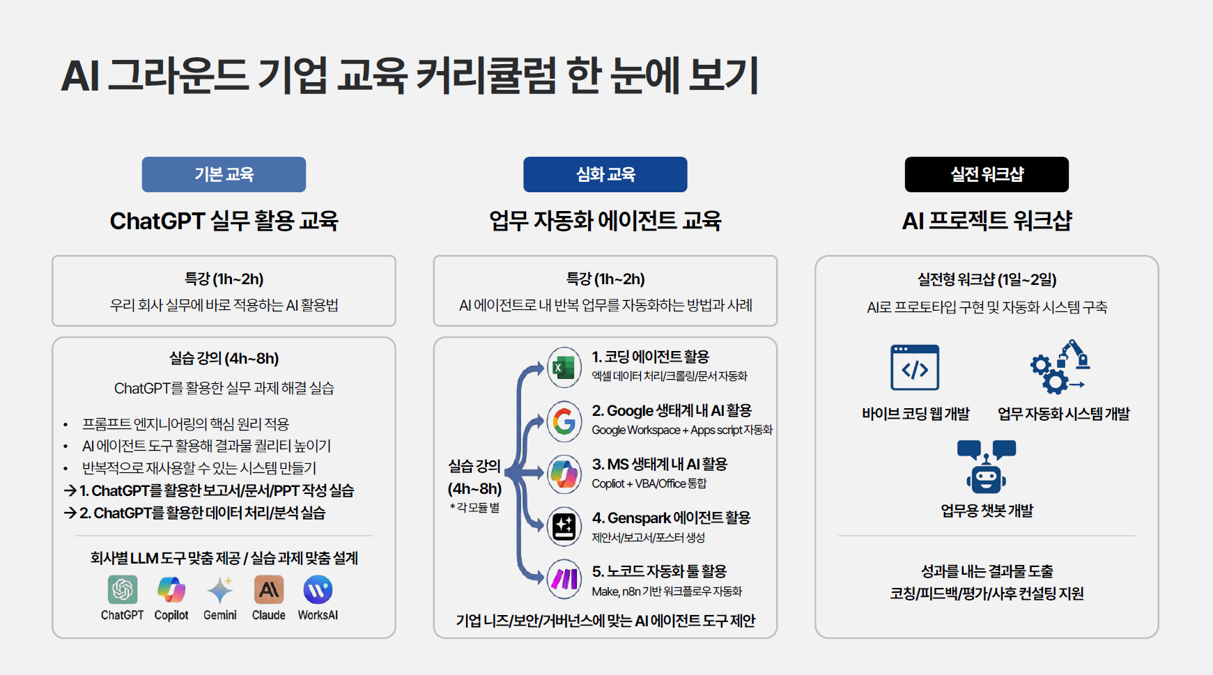 이러한 고민을 반영하여 AI 그라운드의 2026년 단계별 교육 커리큘럼을 정리해보았습니다.