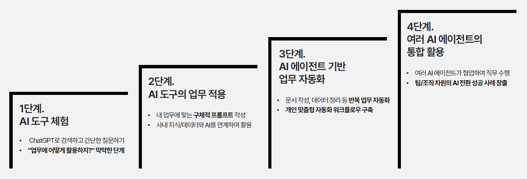 AI 그라운드에서 지난 2년간 200개 이상의 기업과 함께 일하며 기업과 직장인들은 어떤 교육을 필요로 하시는지 이해하게 되었고, AI를 잘 활용하는 조직들을 관찰하면서 어떤 목표를 가지고 AI 전환을 향해 나아가야 할지 기업의 AI 활용 로드맵을 정리할 수 있었습니다.