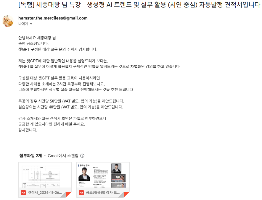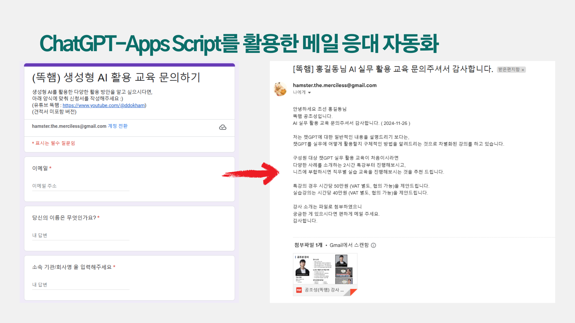 맞춤형 견적서 자동 발송과 같은 고급 기능도 Apps Script 학습 없이 ChatGPT만으로 구현할 수 있습니다.