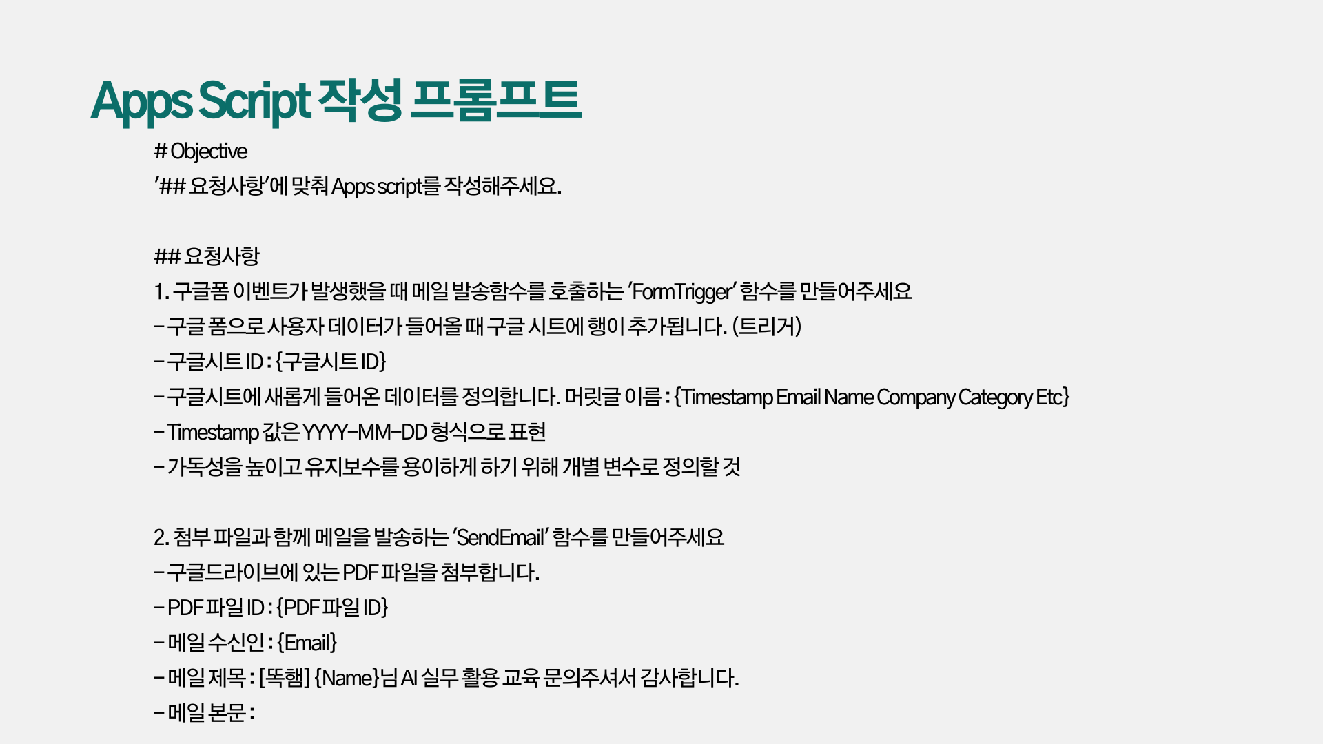- "Apps Script 코드를 작성해주세요"처럼 명확한 요청으로 시작