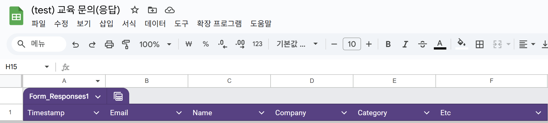 - 구글시트에 새롭게 들어온 데이터를 정의합니다. 머릿글 이름 : {Timestamp Email Name Company Category Etc}