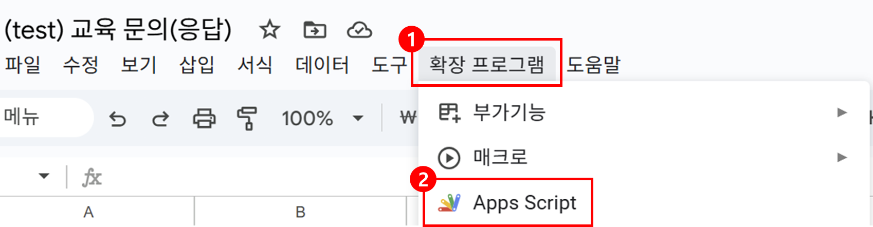 코드 적용을 위해 먼저 구글 시트에서 '확장 프로그램' > 'Apps Script'를 선택해주세요.