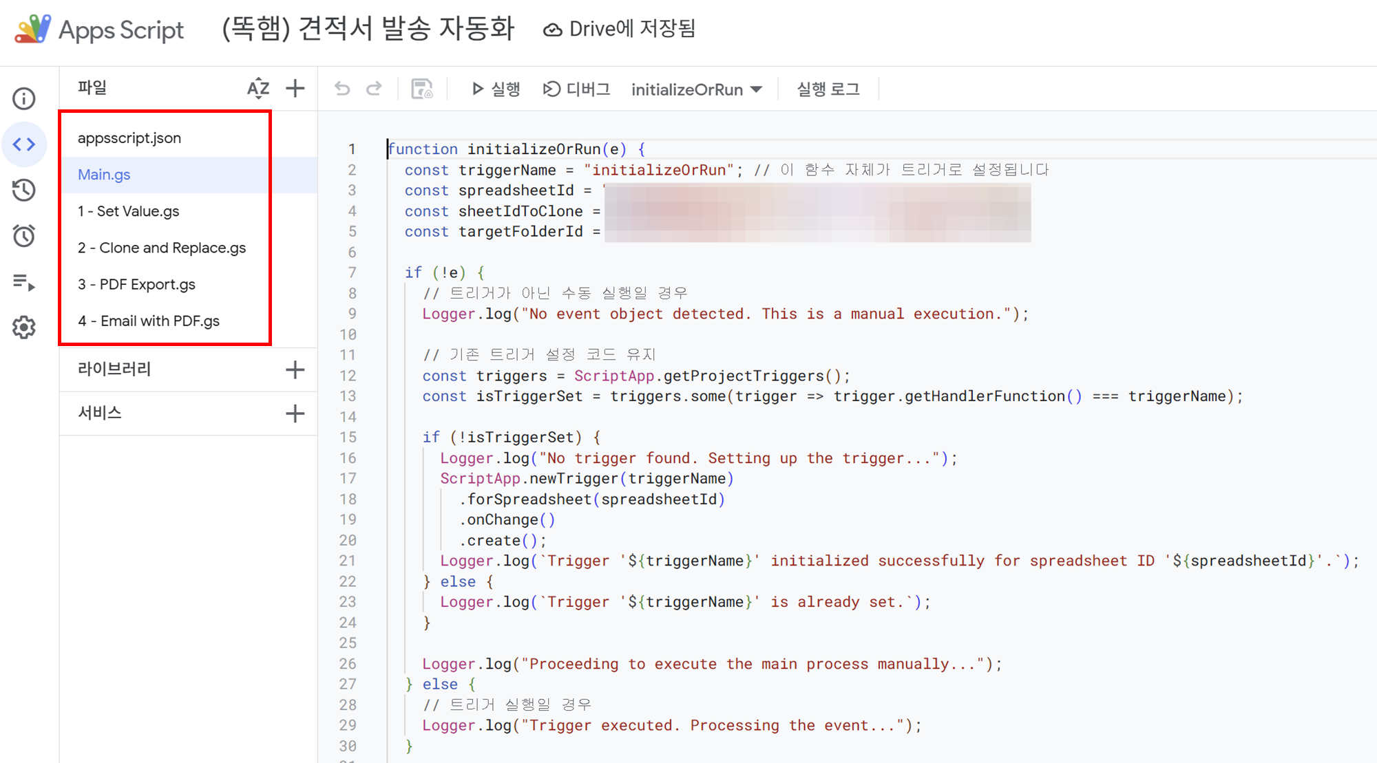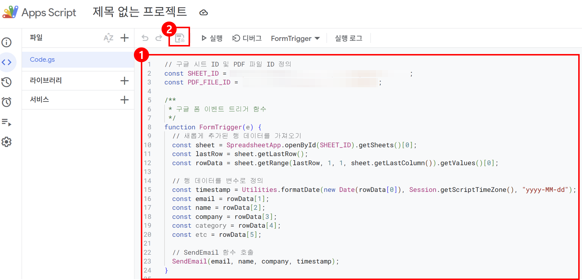 함수의 이름을 정하고 나면, PDF 파일을 첨부할 수 있도록 PDF 파일 ID를 설정합니다. PDF 파일 ID 역시 구글 드라이브의 파일 URL에서 쉽게 확인할 수 있죠.