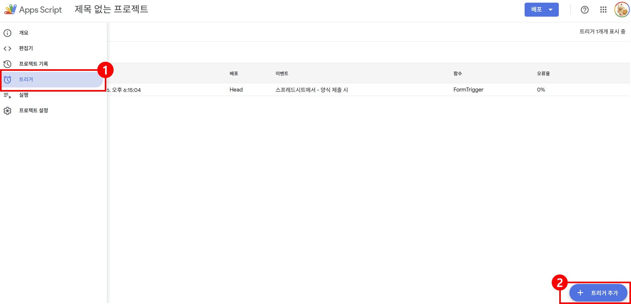 왼쪽 메뉴에서 '트리거'를 클릭하고, 오른쪽 하단의 '트리거 추가' 버튼을 눌러 '양식 제출'을 선택하세요.