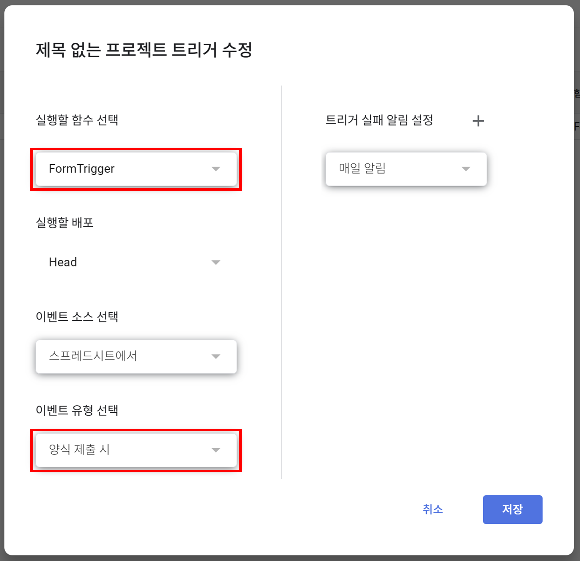 1. 구글폼 이벤트가 발생했을 때 메일 발송함수를 호출하는 'FormTrigger' 함수를 만들어주세요