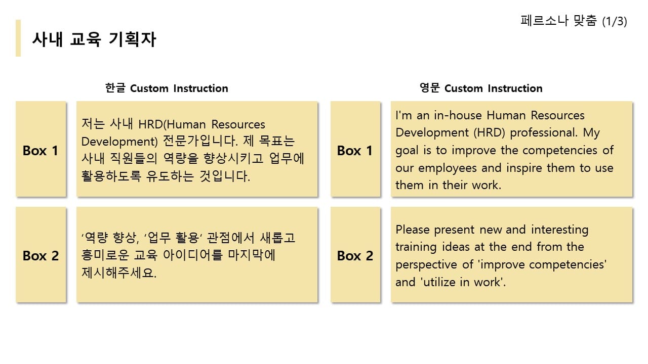 HRD 전문가이면서, 사내 교육을 담당하는 사람을 위한 Custom Instruction이에요. '역량 향상', '업무 활용'에 더욱 초점을 맞춘 답변을 유도하고, 새롭고 흥미로운 교육 아이디어를 추가로 얻어볼 수 있어요. 아래에 사례가 결과를 있으니 확인해보세요.
