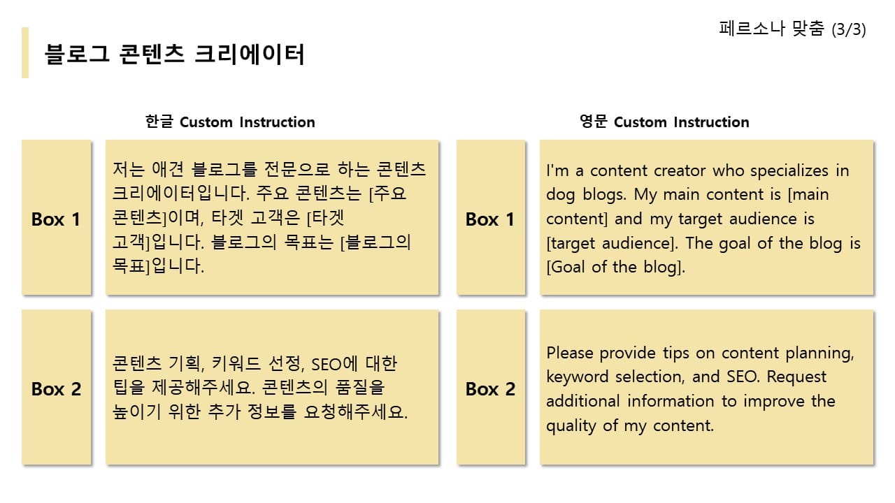 주제, 콘텐츠, 타겟이 명확한 블로그 크리에이터를 위한 Custom Instruction이에요. 이를 통해, 블로그 작성에 필요한 콘텐츠 기획, 키워드 선정, SEO 팁을 추천받고, 사용자에게 콘텐츠의 품질을 높이기 위한 추가 정보 요청을 받을 수 있어요.