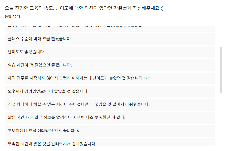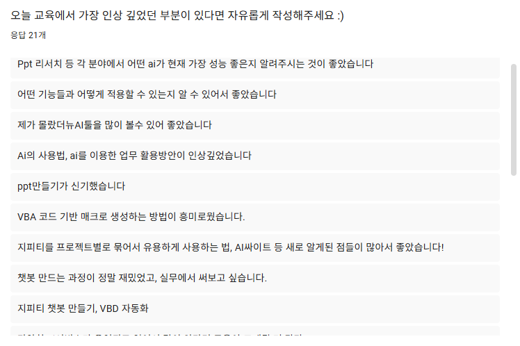 본 실습 교육을 통해 수강자분들은 생성형 AI의 실무 활용법을 중심으로 AI 활용에 대한 이해를 높일 수 있었고, 쉬는 시간에도 끊임없이 질문이 이어질 만큼 높은 관심과 참여 열기를 확인할 수 있었습니다.