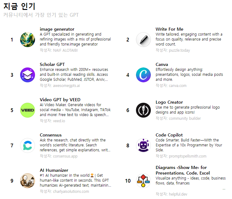- 다양한 GPTs가 공개되어 있어 맞춤형 챗봇으로 활용하기 좋아요.