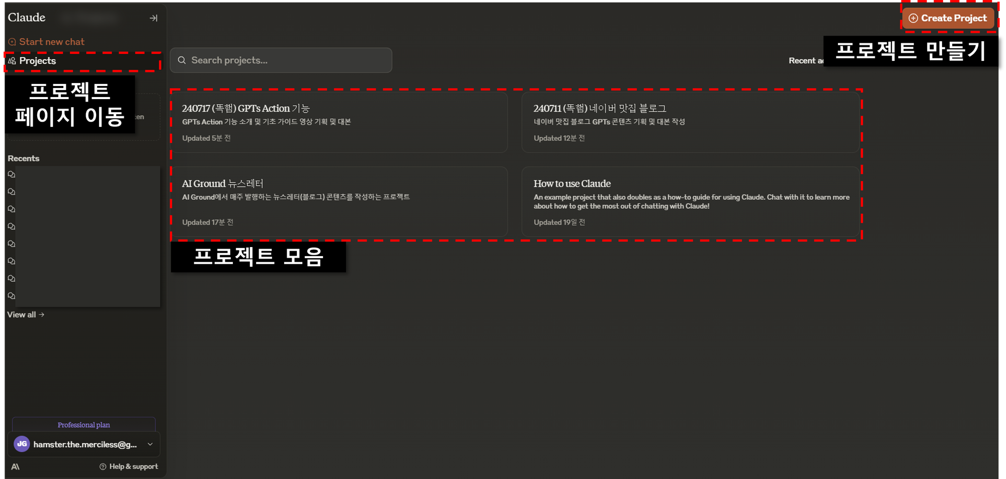 - 프로젝트별로 대화를 모아볼 수 있어요. 이게 정말 편리해요!