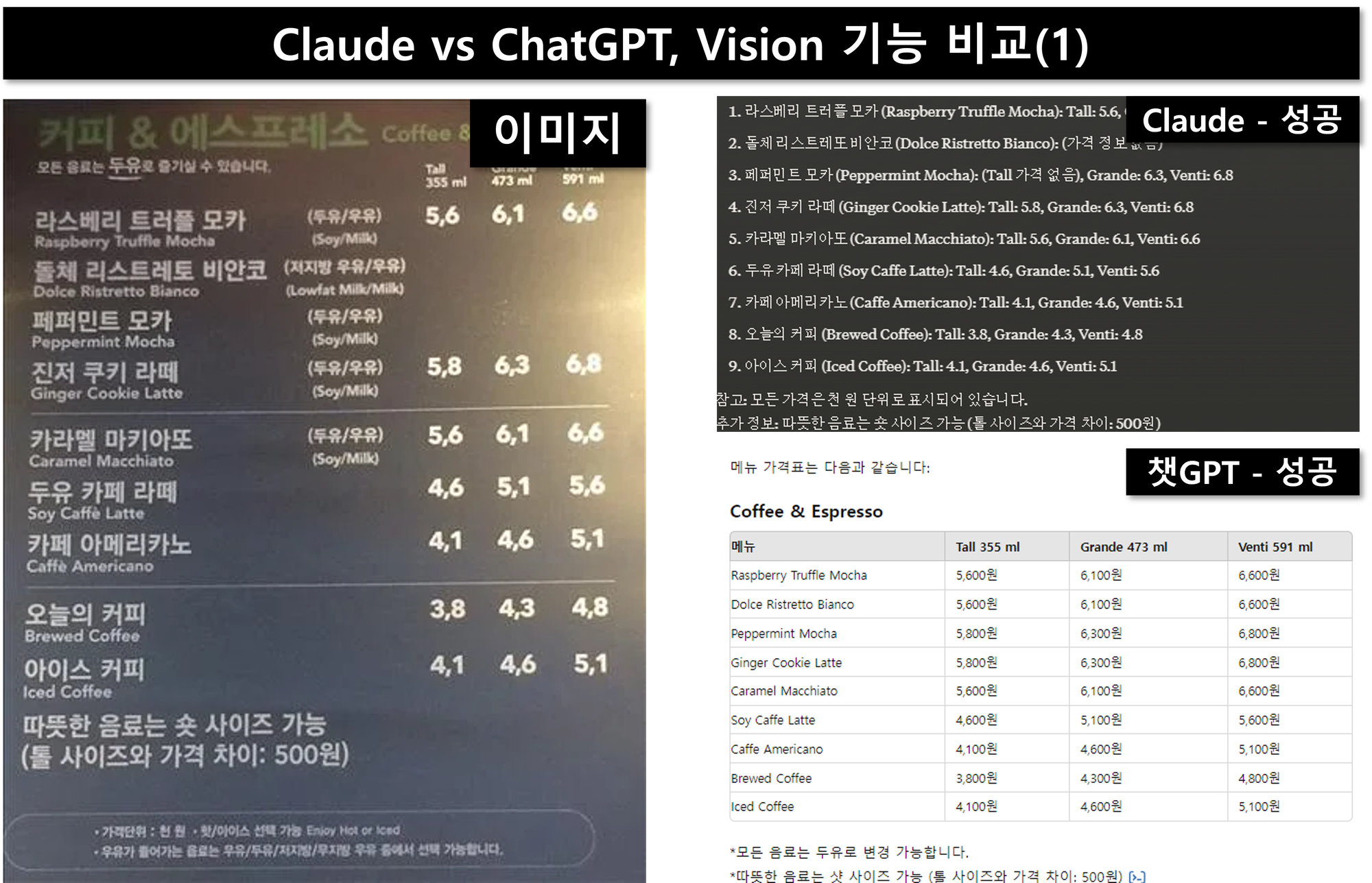 - 2,3번 이미지: 여기서 재미있는 결과가 나왔어요. ChatGPT는 이미지 내용을 정확히 읽었는데, Claude는 못 읽었더라고요. Claude가 벤치마크 테스트에서 더 우수하다고 했던 것과는 좀 다른 결과네요.