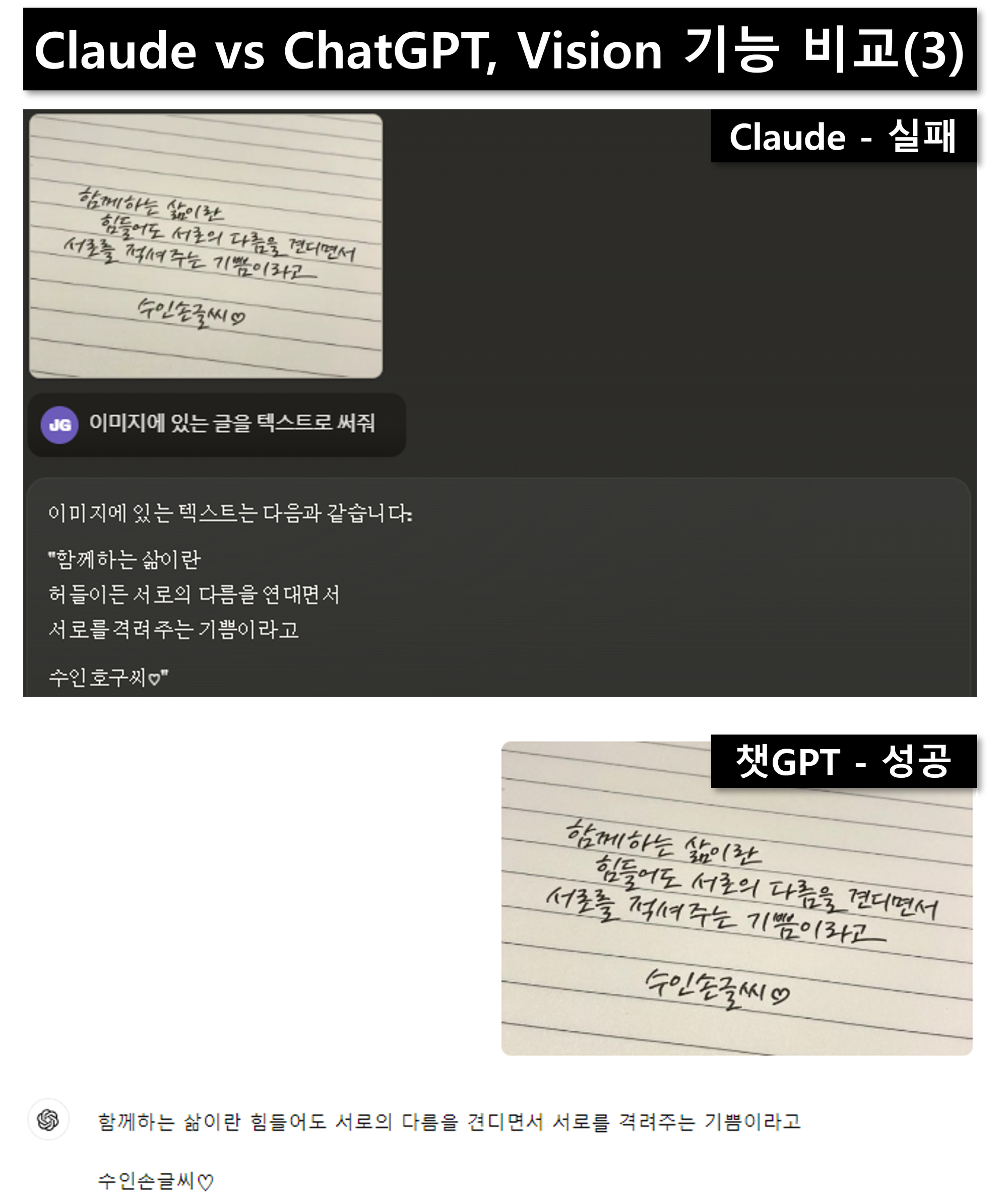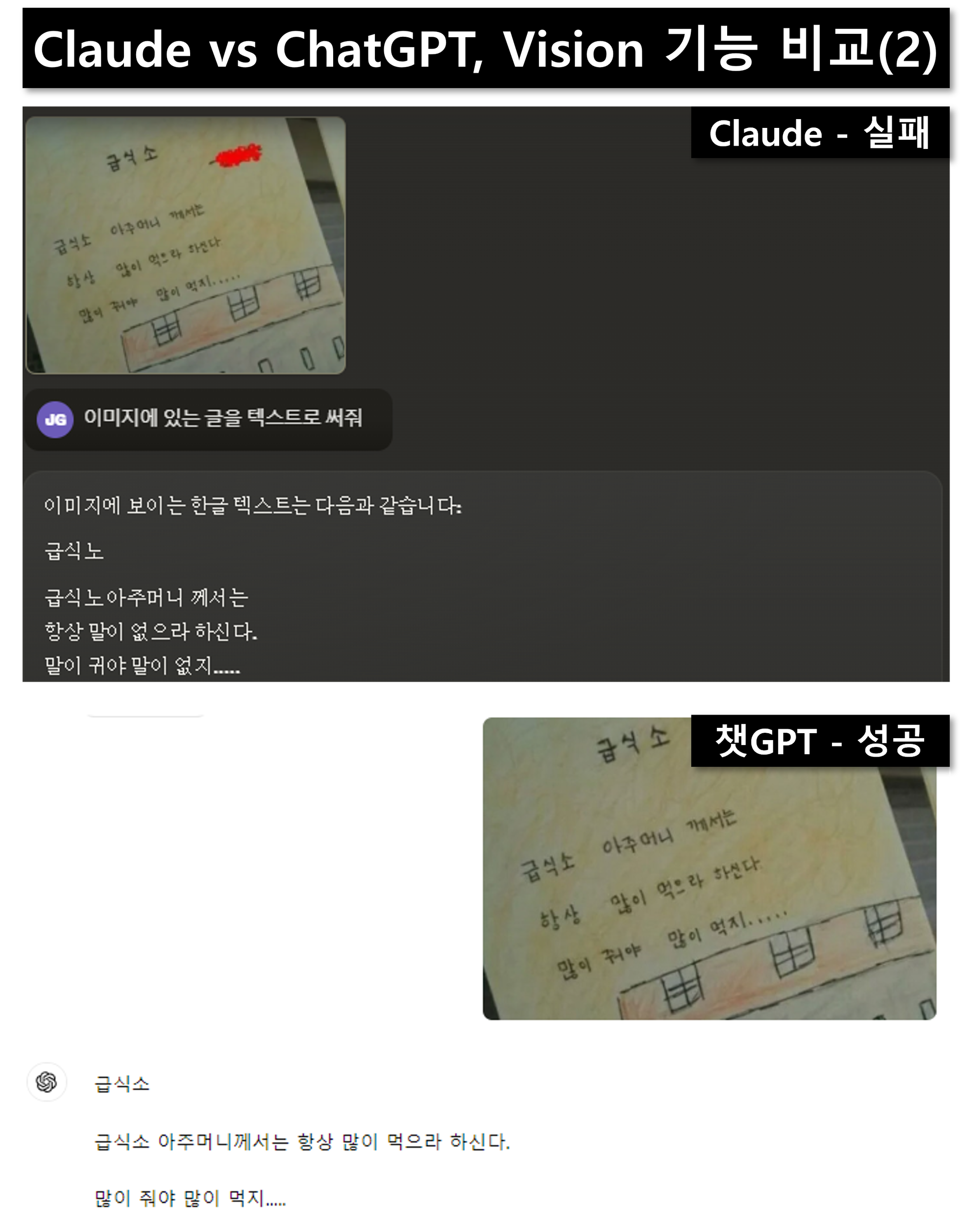 - 4번 이미지: 이건 두 AI 모두 내용을 인식하지 못했어요. 아직 캘리그라피는 둘 다 어려워하는 것 같아요.
