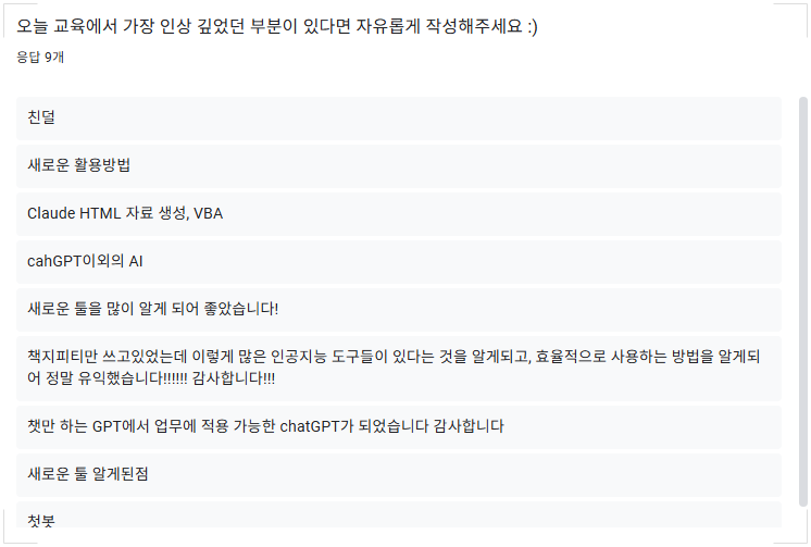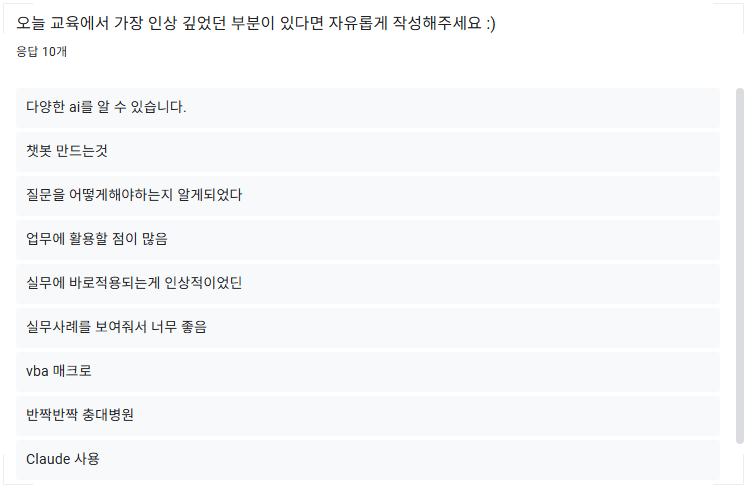 이번 교육을 통해 충남대학교병원 학습자들은 각자의 수준에 맞춰 실무에서 바로 활용할 수 있는 ChatGPT 활용 역량을 갖추게 되었으며, 예상치 못한 도전을 기회로 바꾼 의미 있는 시간이 되었습니다.