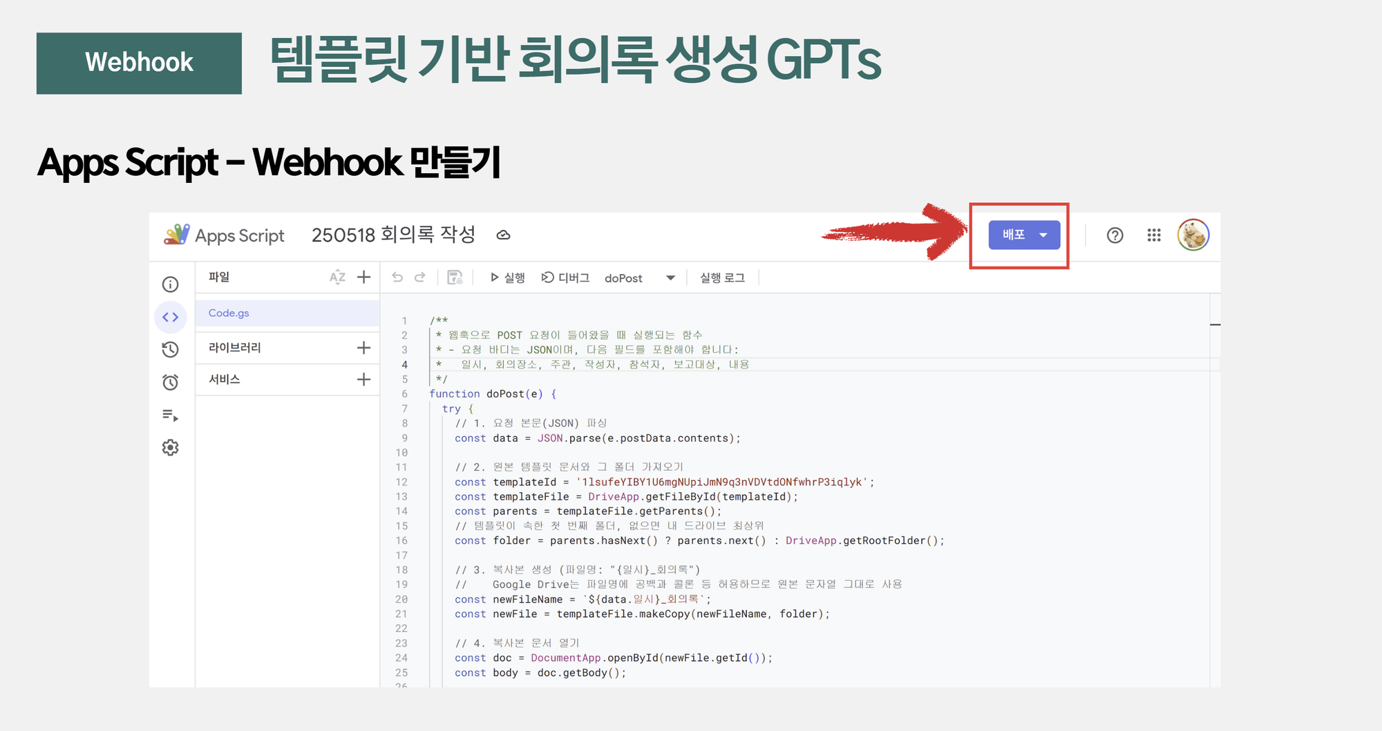 - GPTs에서 받은 정보로 Google Docs 템플릿의 {{변수}} 부분을 실제 내용으로 교체