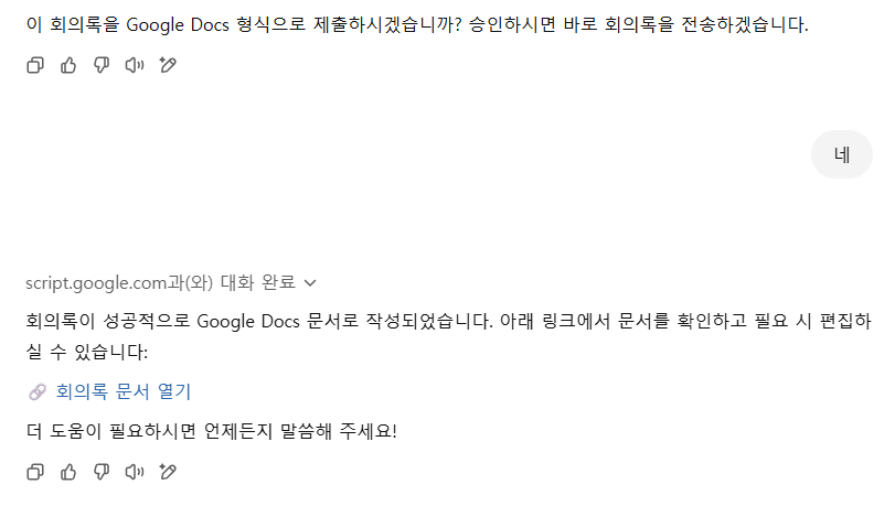 2. 회의록을 작성한 후 사용자에게 'Google Docs 회의록 작성'을 할지 물어봅니다.