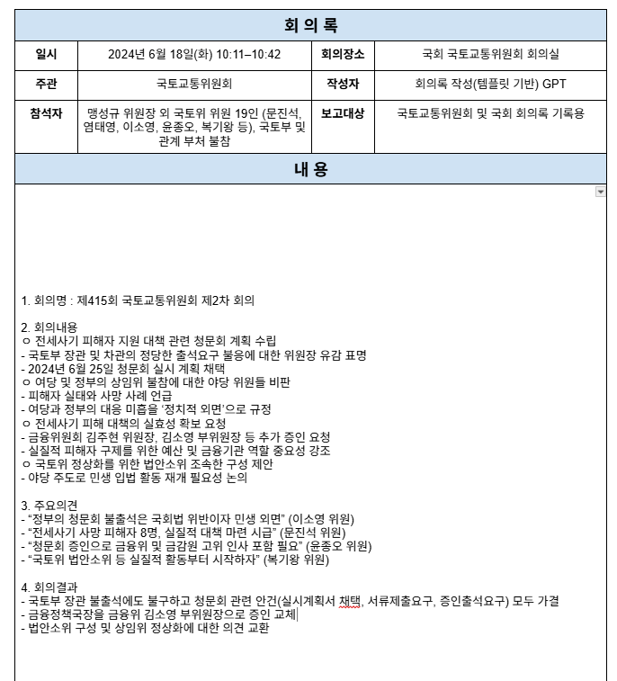 - 녹취록 분석: 업로드된 녹취록을 읽고 회의록 형태로 정리