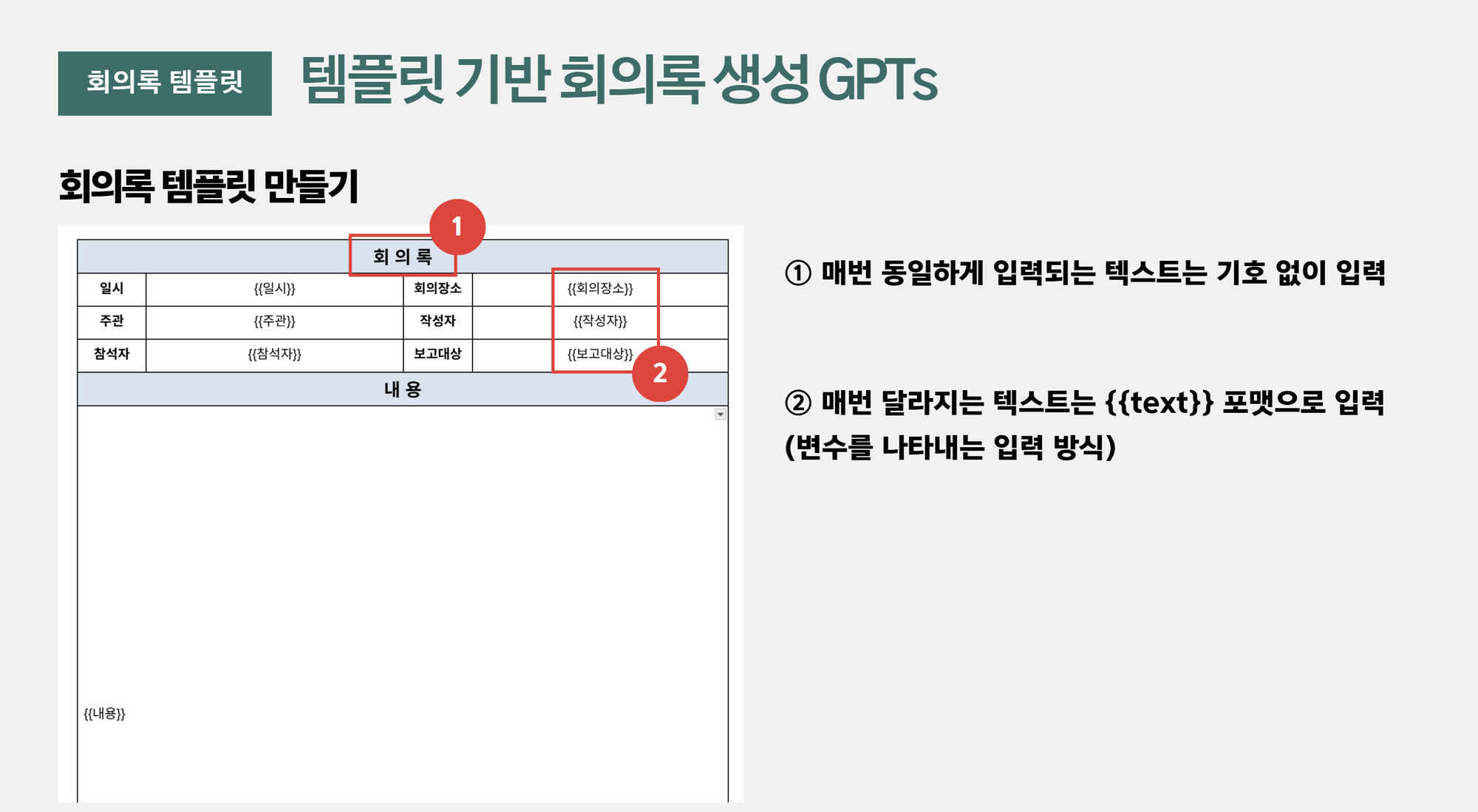 회의록 표에서 실제 내용이 들어갈 자리에 중괄호 두 개를 사용해서 변수명을 써주시면 돼요. 아래 정리한 예시처럼요.