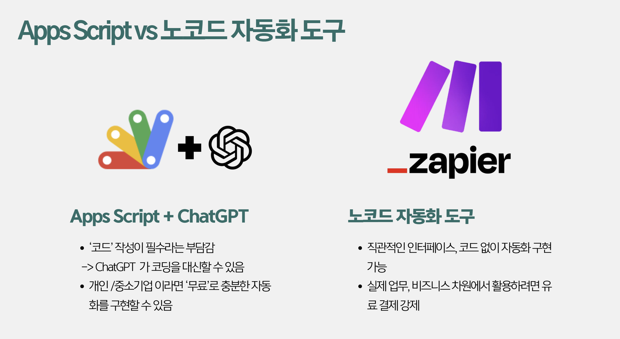오늘은 구글 워크스페이스만 사용할 예정이라서 더 경제적이고 빠른 Apps Script를 선택했어요.