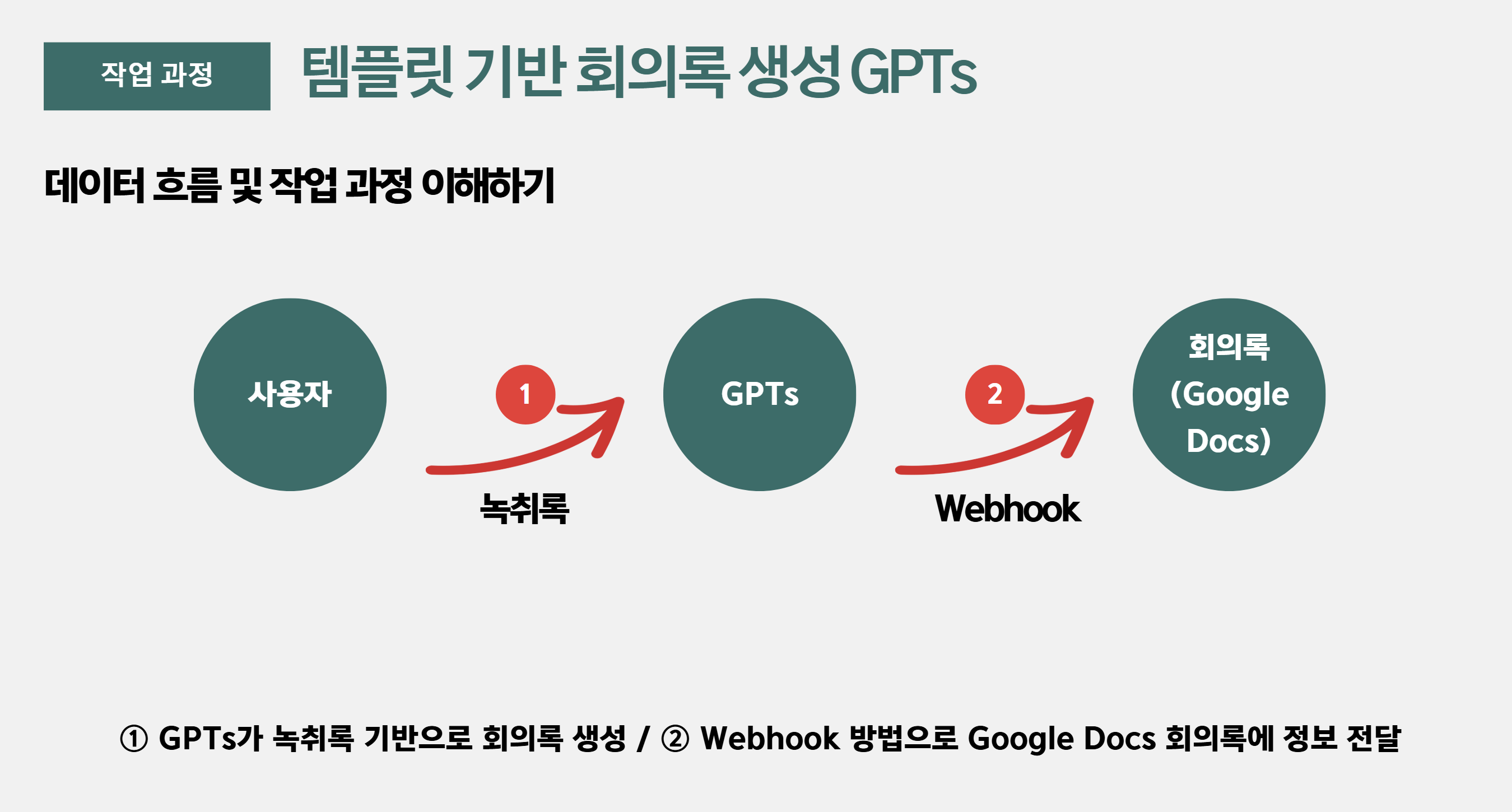 사용자 → 녹취록 업로드 → GPTs → 회의록 텍스트 생성 → Webhook → Apps Script → 템플릿에 내용 채우기 → 완성된 회의록