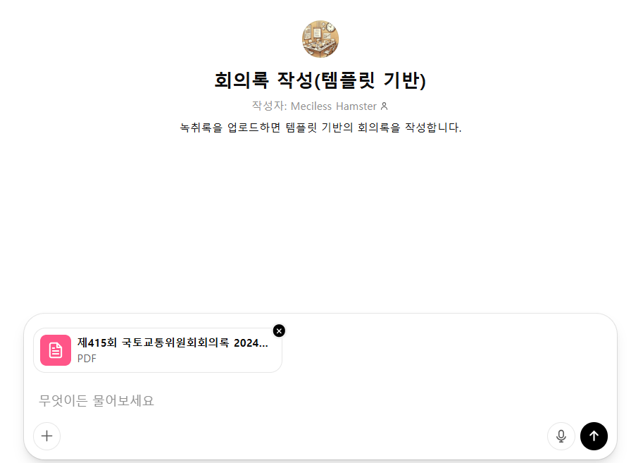 1. 녹취록을 업로드해주세요 회의 녹취록을 GPTs에 업로드하면 돼요. 텍스트 파일이든 PDF든 상관없이 다양한 형태로 올릴 수 있어요.