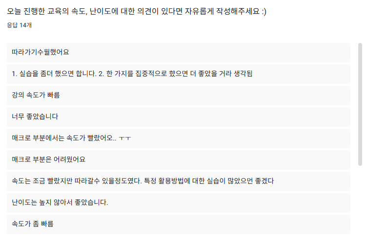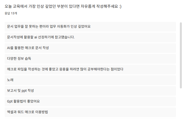 본 실습 중심 교육을 통해 수강자분들은 AI를 보다 효율적으로 활용할 수 있는 확장 방안을 중심으로 AI 활용에 대한 이해를 높일 수 있었습니다.
