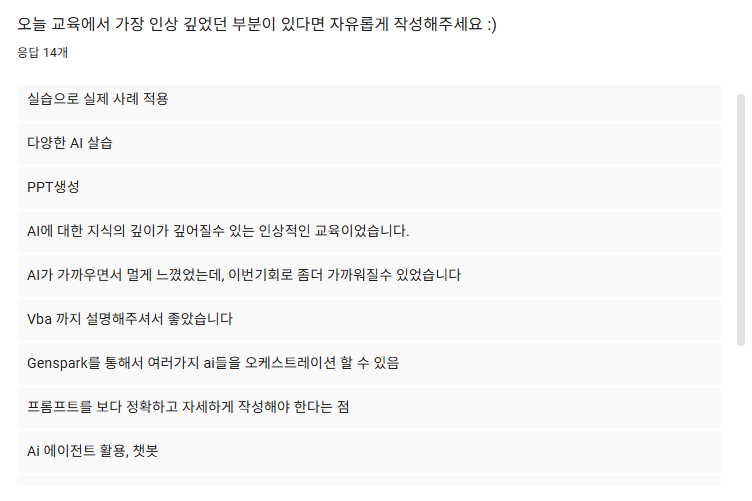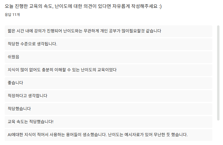 이번 교육을 통해 생성형 AI를 업무에 어떻게 접목할 수 있는지에 대한 실질적인 관점을 함께 나눌 수 있었습니다. 앞으로 이어질 8주 과정에서도 단계적으로 깊이 있는 학습이 이어지기를 기대합니다.