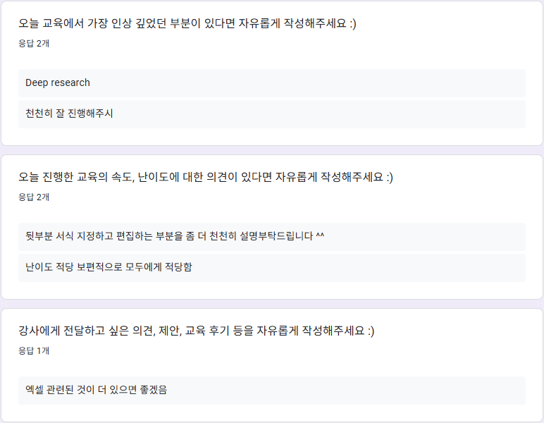 본 실습 중심 교육을 통해 수강자분들은 실무 활용을 중심으로 AI 활용에 대한 이해를 높일 수 있었습니다. 특히, 프롬프트 작성의 기본 개념부터 응용까지 단계적으로 학습하며 바로 활용 가능한 역량을 갖추게 되었다는 평가를 받았습니다.