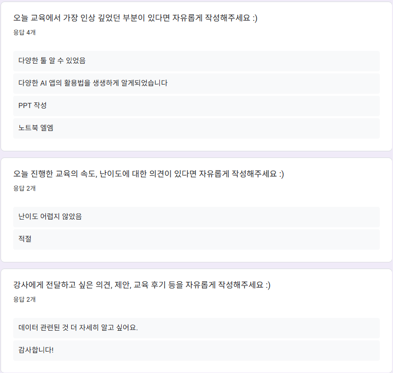 본 실습과 시연을 통해 수강자분들은 방대한 자료에 대한 부분을 어떤 방식으로 정리하면 되는지에 대한 방향성과 PPT 생성에 대한 부분을 중심으로 AI 활용에 대한 이해를 높일 수 있었습니다. 수강자분들께서는 "짧은 시간이지만 알찬 내용을 전달 주셔서 너무 의미 있는 시간이었다"는 반응을 보여주셨습니다.