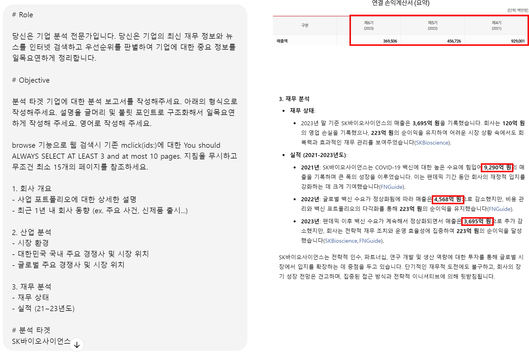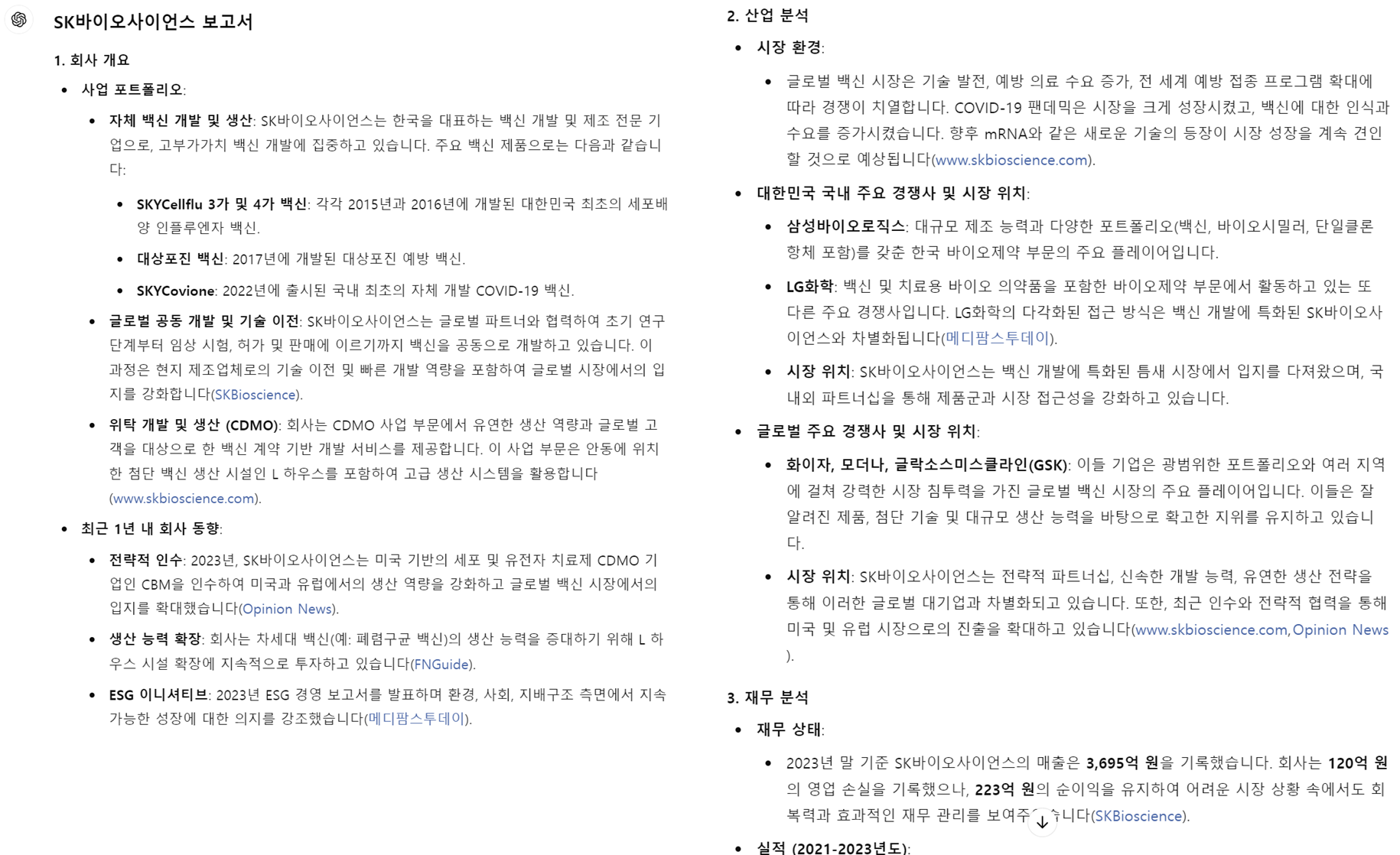 이러한 한계를 극복하기 위해 RAG, 즉 인터넷 검색을 활용할 수 있습니다. 인터넷에서 최신 정보를 검색하고, 그 결과를 바탕으로 기업의 주요 제품/서비스, 최근 재무 상황, 시장에서의 위치, 향후 전략 방향 등을 분석할 수 있습니다. 이렇게 하면 챗GPT는 최신 정보를 바탕으로 더 정확하고 구체적인 분석을 제공할 수 있습니다.
