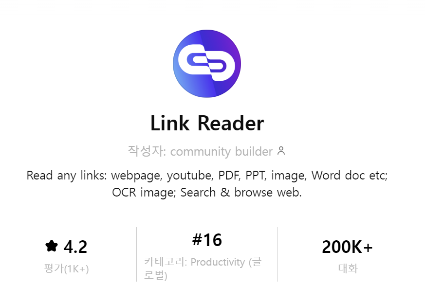 ※ 이번 실습에선 웹페이지를 읽는 GPTs인 'Link Reader'를 활용합니다. 챗GPT가 접근하지 못하는 웹페이지 정보를 읽을 수 있고, 더 풍부하게 정보를 가져옵니다.