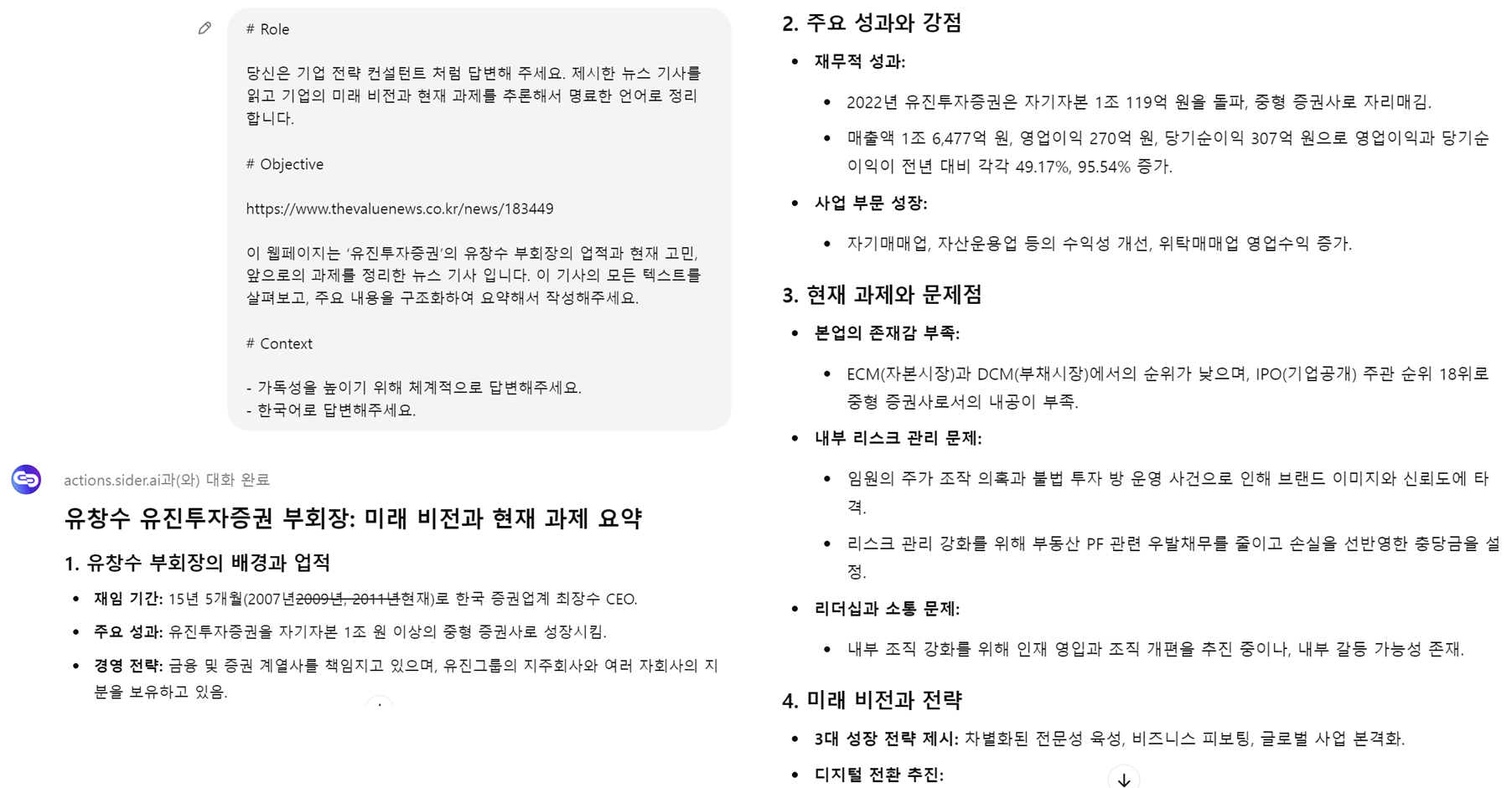 사용자가 기업 임원의 인터뷰 내용을 담은 링크를 제공하고, 챗GPT에게 임원의 마인드셋 및 회사의 전략 방향을 정리해달라고 요청할 수 있습니다. 이때 인터뷰에서 언급된 구체적인 내용을 인용하도록 하면 더욱 좋습니다.
