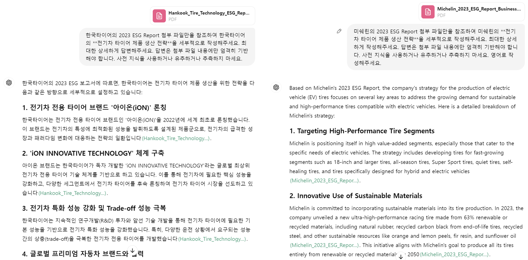 활용 사례: 글로벌 타이어 기업의 전기차 타이어 트렌드 분석 한국타이어와 미쉐린 같은 글로벌 타이어 기업들의 ESG 리포트를 활용하여 전기차 타이어 제품 및 생산 트렜드를 분석해볼 수 있습니다.