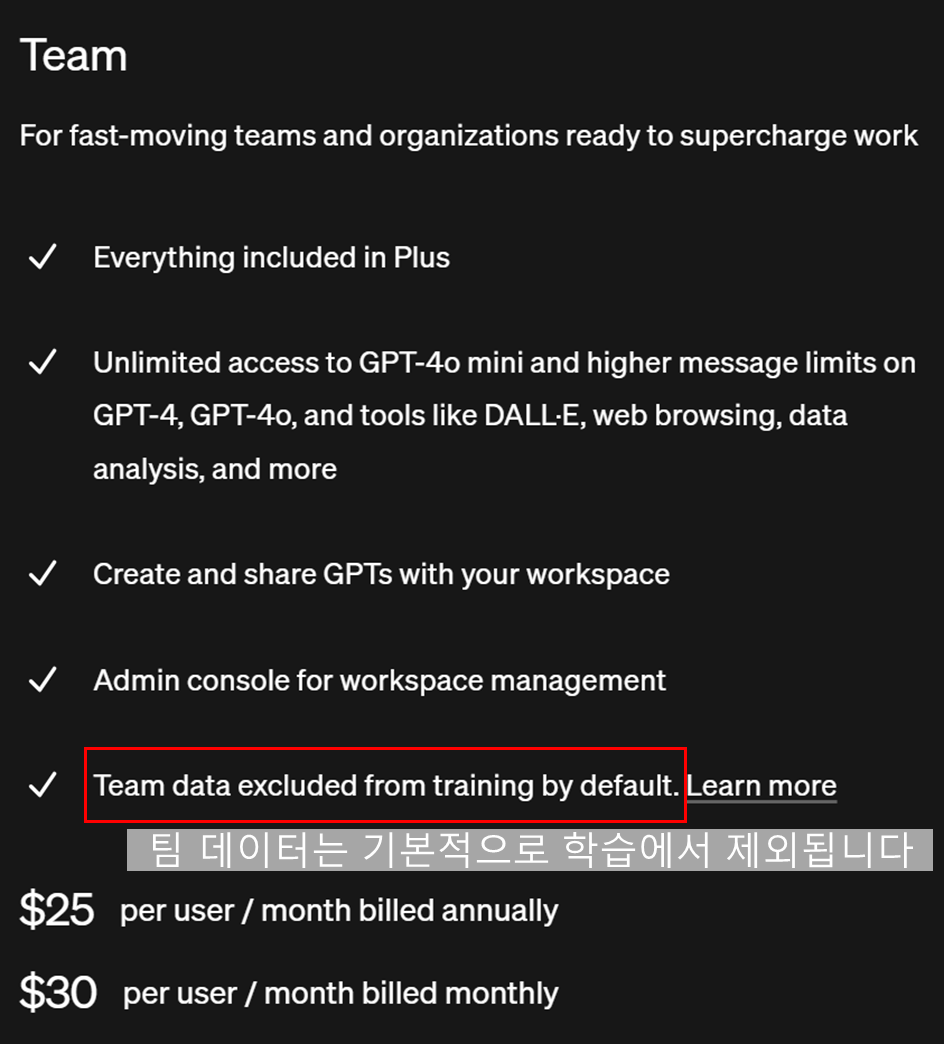 - '팀 플랜' 활용: OpenAI의 '팀 플랜'을 이용하면 대화 내용을 AI 모델 학습에 사용하지 않는다고 합니다. 그러나 이 경우에도 데이터가 일시적으로 서버에 저장될 수 있음을 인지해야 합니다.