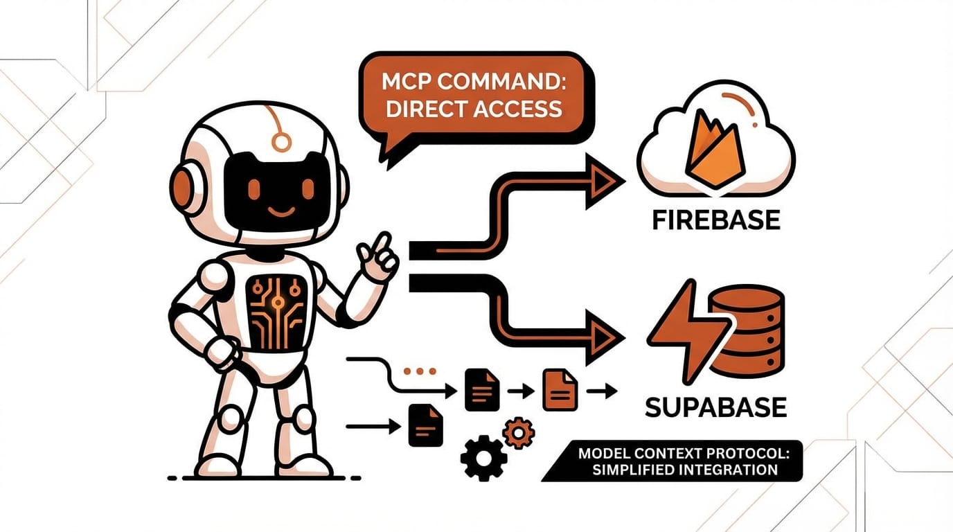[MCP(Model Context Protocol)로 AI가 Firebase와 Supabase를 직접 제어하는 개념도]